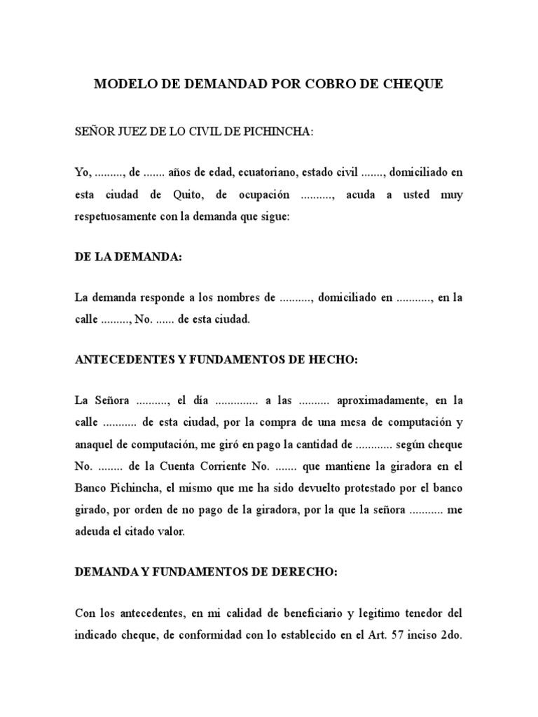 Modelo De Demandad Por Cobro De Cheque Pdf